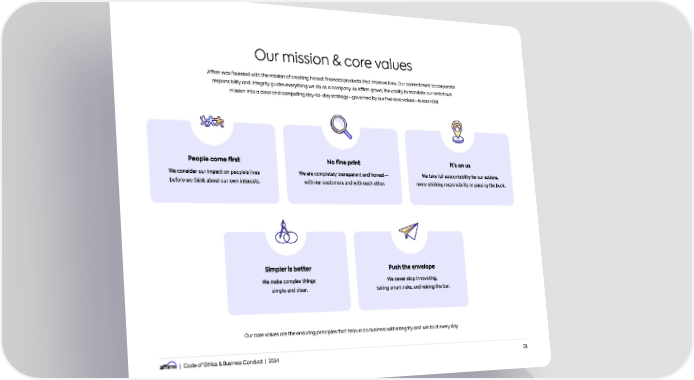 | Code of Ethics & Business Conduct | 2024 03 Our mission & core values Affirm was founded with the mission of creating honest financial products that improve lives. Our commitment to corporate responsibility and integrity guides everything we do as a company. As Affirm grows, the ability to translate our ambitious mission into a clear and compelling day-to-day strategygoverned by our five core valuesis essential. Our core values are the enduring principles that help us do business with integrity and win trust every day. People come first We consider our impact on peoples lives before we think about our own interests. Its on us We take full accountability for our actions, never shirking responsibility or passing the buck. No fine print We are completely transparent and honest with our customers and with each other. Simpler is better We make complex things simple and clear. Push the envelope We never stop innovating, taking smart risks, and raising the bar.