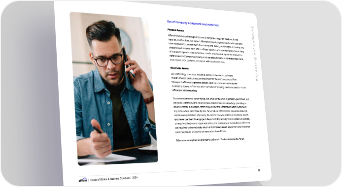 | Code of Ethics & Business Conduct | 2024 18 Use of company equipment and materials Physical Assets Affirmers have a wide range of access to tangible things, like furniture, funds, supplies, and facilities. We expect Affirmers to treat physical assets with care and take measures to prevent them from being lost, stolen, or damaged, including any unauthorized removal from Affirm offices. Reach out to our Workplace team if any of our assets appear to be defective, unsafe, or in need of repair. We reserve the right to search Company property, such as desks, lockers, or other storage areas, and inspect their contents consistent with applicable laws. Electronic Assets Our technology resources, including computer hardware, software, mobile devices, and tablets, are important to the work we do at Affirm. We expect Affirmers to protect, secure, and use them appropriately for business purposes. Affirm has strict rules about securing electronic assetsin the office and while traveling. Occasional personal use of things, like email or the web, is generally permitted, but use good judgment, and never access unauthorized websites (e.g., gambling or adult content). In addition, Affirm may review the contents of Affirm systems at any time, where permitted by law. Personal use of Company resources does not create an expectation of privacy. Be careful how you utilize our electronic assets and never use them to engage in illegal activity, activity that violates our policies, or anything that would negatively affect the Company or its reputation. Affirmers are required to immediately return all Company-issued equipment and materials upon request by or upon their separation from Affirm. Affirmers are required at all times to adhere to the Acceptable Use Policy. P r o t e c t i n g o u r c o m p a n y