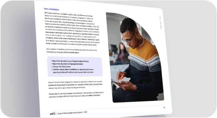 | Code of Ethics & Business Conduct | 2024 09 Non-retaliation Affirm has a strict non-retaliation policy, meaning Affirmers will not be disciplined or otherwise experience an adverse employment action for reporting a suspected violation of the Code, other workplace policies, or the law, in good faith, or participating in an investigation related to or opposing potential violations, of the Code, other workplace policies, or the law. An adverse employment action is conduct or an action that materially affects the terms and conditions of the Affirmers employment status, or would tend to discourage a reasonable person from reporting a suspected violation in good faith, or participating in an investigation related to or opposing potential violations, of the Code, other workplace policies, or the law. Reporting in good faith doesnt require certaintyit means honestly believing that information is being provided truthfully and accurately about the concern being raised. Any suspicion of retaliatory practices should be promptly reported to the Company by using any of the channels below: Anyone found to have engaged in retaliation against an Affirmer who reports (potential) misconduct in good faith is in violation of the Code, and may face disciplinary action, up to and including termination. Please refer to the Policy Against Discrimination, Harassment, and Retaliation in your local Guide to Affirm for the Companys policy prohibiting retaliation. Report the situation to your People Business Partner Report the situation to Employee Relation Contact the Ethics teat Submit a report, either identifiably or anonymously, to our reporting hotline AffirmEthics.com by web, SMS, or phone S p e a k u p