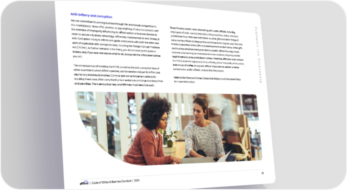 | Code of Ethics & Business Conduct | 2024 23 Anti-bribery and corruption We are committed to winning business through fair and honest competition in the marketplace. Never offer, promise, or pay anything of value to someone with the intention of improperly influencing an official action or business decision in order to secure a business advantage. Affirm has implemented an Anti-Bribery & Anti-Corruption Policy to inform and guide compliance with both the letter and spirit of applicable anti-corruption laws, including the Foreign Corrupt Practices Act (FCPA). As further detailed in the Policy, you should never participate in bribery and, if you ever are unsure what to do, always ask the Ethics team before you act. The consequences of violating the FCPA, as well as the anti-corruption laws of other countries in which Affirm operates, can be severenot just for Affirm, but also for any individuals involved. Criminal and civil enforcement actions for violating these laws often carry harsh prison sentences and large monetary fines and penalties. This is serious business, and Affirmers must treat it as such. Be particularly careful when interacting with public officials, including employees of state-owned enterprises. Many countries, states, and local jurisdictions have limits and restrictions on what gifts and other things of value can be offered to these parties and those limits may be lower than the threshold specified in the Gifts and entertainment section below. While gifts and business entertainment provided to a public official for a legitimate business purpose may be reasonable in some locations, they may violate legal thresholds or be prohibited in others. Therefore, Affirmers must contact the Ethics team for approval prior to offering gifts or hospitality of any value, even a cup of coffee, to a public official. If you are not certain whether someone is a public official, contact the Ethics team. Refer to the Financial Crimes Global Anti-Bribery and Corruption Policy for more information. P r o t e c t i n g o u r c o m p a n y