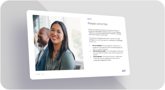 A F F I R M | 2 0 2 4 People come first BENEFITS Affirmers are empowered to perform their best with impactful benefits that help support all aspects of their lives and wellbeing. Healthy and supported employees are foundational to cultivating high-performing and inclusive teams. Our benefits are designed with intention to protect the health, wellbeing, future, and loved ones of our employees. Our philosophy at Affirm is to: Set the standard among competitors to make Affirm an employer of choice and offer person-first benefits/perks that reflect our diverse employees. Meet the diverse needs of our evolving global workforce and frequently collect feedback to ensure their emerging needs are met. Reduce barriers financial and otherwiseto reduce any friction that prevents employees from effectively and proactively managing their health.