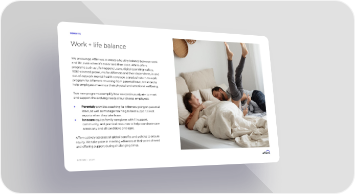 A F F I R M | 2 0 2 4 BENEFITS We encourage Affirmers to create a healthy balance between work and life, even when its easier said than done. Affirm offers programs such as Life Happens Leave, digital spending wallets, 100%-covered premiums for Affirmers and their dependents, in and out-of-network mental health coverage, a gradual return-to-work program for Affirmers returning from parental leave, and more to help employees maximize their physical and emotional wellbeing. Two new programs exemplify how we continuously aim to meet and support the evolving needs of our diverse employees: Parentaly provides coaching for Affirmers going on parental leave, as well as manager training to best support direct reports when they take leave. Ianacare equips family caregivers with 1:1 support, community, and practical resources to help coordinate care across any and all conditions and ages. Affirm actively assesses all global benefits and policies to ensure equity. We take pride in meeting Affirmers at their point of need and offering support during challenging times. Work + life balance