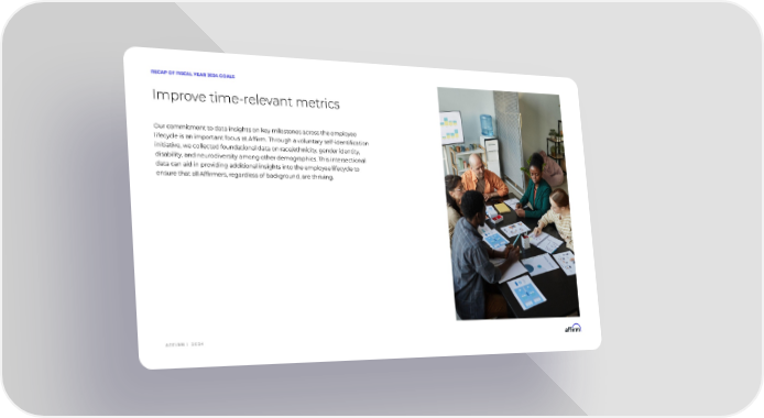 A F F I R M | 2 0 2 4 Improve time-relevant metrics Our commitment to data insights on key milestones across the employee lifecycle is an important focus at Affirm. Through a voluntary self-identification initiative, we collected foundational data on race/ethnicity, gender identity, disability, and neurodiversity among other demographics. This intersectional data can aid in providing additional insights into the employee lifecycle to ensure that all Affirmers, regardless of background, are thriving. RECAP OF FISCAL YEAR 2024 GOALS