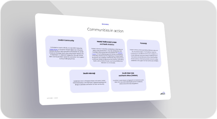 A F F I R M | 2 0 2 4 Jewish Community Co-hosted an event with B.L.A.C.K.@ Affirm featuring Nissim Black, an American-Israeli rapper and influencer. Additionally, they held a powerful conversation for Jewish American Heritage Month discussing Jewish identity and Antisemitism: A Historical Perspective Through Stories. Both events provided a space for connection and support during challenging times. Communities in action BELONGING Mental Wellness@ Europe and North America Hosted a Burnout Hackathon, addressing a critical issue in today's work environment. They also collaborated with Parents@ Affirm to host self-care sessions with Manifest House, a virtual wellbeing space for women and femmes, where they emphasized the importance of mental health for parents and caregivers. Additionally, they held powerful workshops related to effective communication, discussing topics such as Radical Candor and Cultural Differences between U.S. and Europe. Parents@ Hosted numerous initiatives inviting Affirmers to give, ask for, and receive support. From hosting a deep-dive conversation on benefits for parents and caregivers to a virtual Halloween costume contest to Mother's/Father's Day events and even Bring Your Kid to Work Day, they drove numerous initiatives to enable connection, safety, celebration, and support for their community members. South Asians@ Celebrated Diwali with special boxes and events, hosted WinItWednesdays, and organized in-person meetings and Bingo to promote connection for their community. South West Asia and North Africa (SWANA) Launched a social impact campaign for humanitarian aid in Israel and Gaza, demonstrating the power of collective action and community engagement.