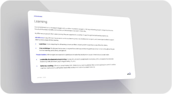 A F F I R M | 2 0 2 4 Learning ADVANCEMENT Our commitment to our employees begins with our Affirm Foundation program, a 100-day onboarding program designed to help new hires build foundational skills, connections, and knowledge to succeed in their roles. As Affirmers progress in their career journey, they are supported in a number of ways through blended learning experiences. All Affirmers: Every Affirmer has access to continuous learning resources, development programs, and career opportunities to support them at every stage of their journey. LearnNow : A one-stop shop for all learning content at Affirm, including 6,000+ eLearning courses offered by Udemy. Live workshops : Employees have access to targeted live workshops and learning pathways at key moments throughout the year to drive learning, productivity, and growth. People leaders: All managers are expected to participate in leadership development as part of their role as a people leader. Leadership development programming: A series of curricula for people leaders to develop, refine, and practice foundational leadership skills (feedback, psychological safety, 1:1s, etc.). BetterUp coaching : Offered to senior leaders (L8+), BetterUp is a coaching platform that connects participants with ICF-certified coaches. Used as both a self-guided leadership development tool and a support resource.