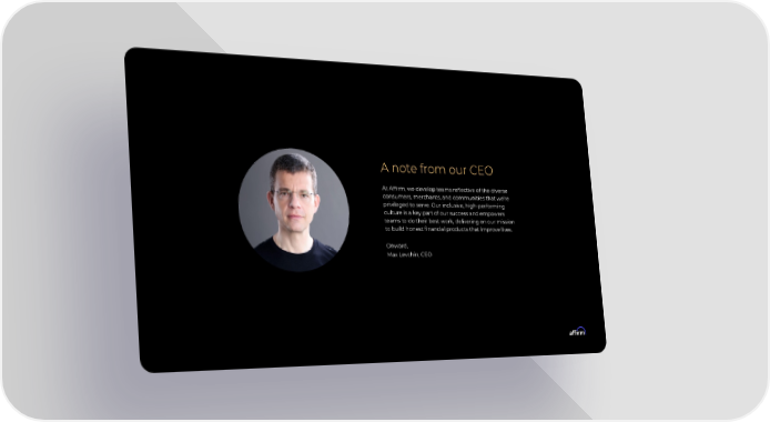 At Affirm, we develop teams reflective of the diverse consumers, merchants, and communities that were privileged to serve. Our inclusive, high-performing culture is a key part of our success and empowers teams to do their best work, delivering on our mission to build honest financial products that improve lives. Onward, Max Levchin, CEO A note from our CEO