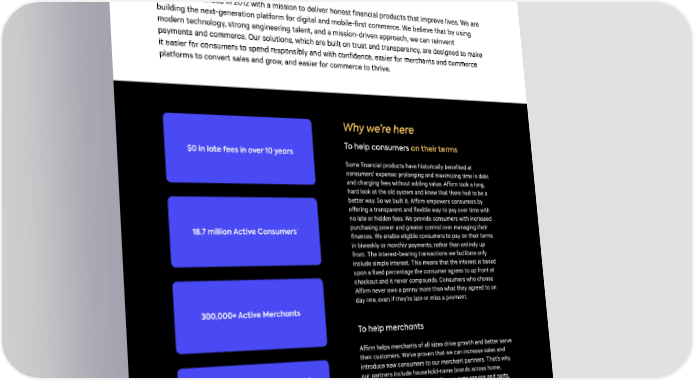 About A昀케rm Who we ar漀 A昀昀irm was founded in 2012 with a mission to deliver honest financial products that improve lives. We are building the next-generation platform for digital and mobile-first commerce. We believe that by using modern technology, strong engineering talent, and a mission-driven approach, we can reinvent payments and commerce. Our solutions, which are built on trust and transparency, are designed to make it easier for consumers to spend responsibly and with confidence, easier for merchants and commerce platforms to convert sales and grow, and easier for commerce to thrive. Why we’re here To help consumers on their term紀 $0 in late fees in over 10 years Some financial products have historically benefited at consumers’ expense: prolonging and maximizing time in debt and charging fees without adding value. A昀昀irm took a long, hard look at the old system and knew that there had to be a better way. So we built it. A昀昀irm empowers consumers by o昀昀ering a transparent and flexible way to pay over time with no late or hidden fees. We provide consumers with increased purchasing power and greater control over managing their 1 18.7 million Active Consumers finances. We enable eligible consumers to pay on their terms in biweekly or monthly payments, rather than entirely up front. The interest-bearing transactions we facilitate only include simple interest. This means that the interest is based upon a fixed percentage the consumer agrees to up front at checkout and it never compounds. Consumers who choose A昀昀irm never owe a penny more than what they agreed to on day one, even if they’re late or miss a payment. 300,000+ Active Merchants To help merchant紀 A昀昀irm helps merchants of all sizes drive growth and better serve their customers. We’ve proven that we can increase sales and introduce new consumers to our merchant partners. That’s why our partners include household-name brands across home, 2023 Newsweek’s Most Trusted lifestyle, fashion, beauty, travel, fitness, auto service and parts, Companies in Americ欀 and more. This network is further bolstered by the A昀昀irm app, A昀昀irm ranked 6th out of 44 companies in th攠⠀ which gives consumers a convenient way to use A昀昀irm as an financial services industry in customer trust omnichannel payment method, while providing a marketplace for merchants to reach consumers. All figures presented in this Report are as of June 30, 2024 unless otherwise note渀 1 Active Consumers defined as consumers who engage in at least one transaction on A昀昀irm’s platform during the 12 months prior to the measurement date. 2024 ESG REPORT 4