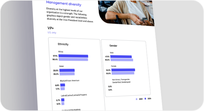 Management diversit茀 Diversity at the highest levels of our organization is a strength. The following graphics depict gender and racial/ethnic diversity at the Vice President level and above: VP+ U.S. only Ethnicit礀 Gende爀 White Male 57.1% 47.5% 56.4% 50.0% Asian Female 28.6% 52.5% 28.2% 50.0% Black/African American Non-binary, Transgender,†⠀ Genderfluid, Genderqueer 8.6% 0.0% 7.7% 0.0% Latiné/Latinx/Latina/o/Hispanic 5.7% 2023 2024 5.1% Multiracial/Multiethnic 0.0% 2.6% 2023 2024 2024 ESG REPORT 12