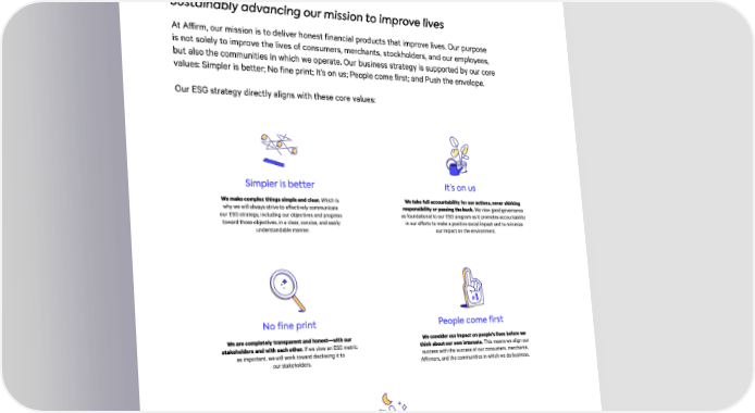 A昀케rm’s ESG strategy: Simpler is better Sustainably advancing our mission to improve live紀 At A昀昀irm, our mission is to deliver honest financial products that improve lives. Our purpose is not solely to improve the lives of consumers, merchants, stockholders, and our employees, but also the communities in which we operate. Our business strategy is supported by our core values: Simpler is better; No fine print; It’s on us; People come first; and Push the envelope.ꨀ Our ESG strategy directly aligns with these core values: Simpler is better It’s on us We make complex things simple and clear. Which is We take full accountability for our actions, never shirking why we will always strive to e昀昀ectively communicate responsibility or passing the buck. We view good governance our ESG strategy, including our objectives and progress as foundational to our ESG program as it promotes accountability toward those objectives, in a clear, concise, and easily in our e昀昀orts to make a positive social impact and to minimize understandable manner. our impact on the environment. No昀椀neprint Peoplecome昀椀rst We are completely transparent and honest—with our We consider our impact on people’s lives before we stakeholders and with each other. If we view an ESG metric think about our own interests. This means we align our as important, we will work toward disclosing it t漠⠀ success with the success of our consumers, merchants, our stakeholders. A昀昀irmers, and the communities in which we do business. Pushtheenvelope We never stop innovating, taking smart risks, and raising the bar. We actively manage our environmental impact across our facilities, which includes practices and partnerships focused on addressing climate change, sustainably managing resources, and mitigating our environmental impact. 2024 ESG REPORT 6