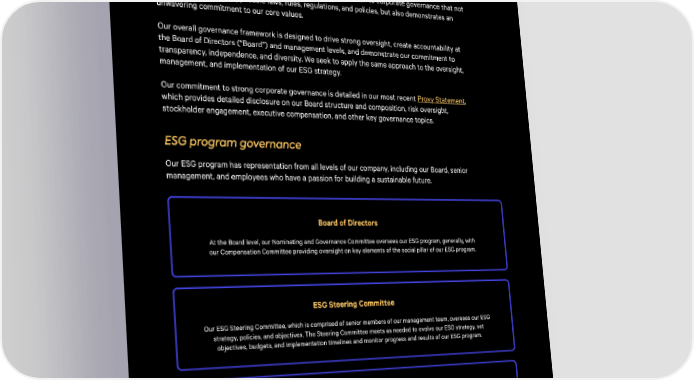 Governance: It’s On Us We believe that good governance drives the creation and preservation of value for our stockholders and other stakeholders. This includes a comprehensive approach to corporate governance that not only complies with all applicable laws, rules, regulations, and policies, but also demonstrates an unwavering commitment to our core values㠀 Our overall governance framework is designed to drive strong oversight, create accountability at the Board of Directors (“Board”) and management levels, and demonstrate our commitment to transparency, independence, and diversity. We seek to apply the same approach to the oversight, management, and implementation of our ESG strategy.ꨀ Our commitment to strong corporate governance is detailed in our most recent Proxy Statement, which provides detailed disclosure on our Board structure and composition, risk oversight, stockholder engagement, executive compensation, and other key governance topics. ESG program governanc漀 Our ESG program has representation from all levels of our company, including our Board, senior management, and employees who have a passion for building a sustainable future. Board of Director紀 At the Board level, our Nominating and Governance Committee oversees our ESG program, generally, with our Compensation Committee providing oversight on key elements of the social pillar of our ESG program. ESG Steering Committe漀 Our ESG Steering Committee, which is comprised of senior members of our management team, oversees our ESG strategy, policies, and objectives. The Steering Committee meets as needed to evolve our ESG strategy, set objectives, budgets, and implementation timelines and monitor progress and results of our ESG program. ESG Working Grou稀 Our ESG Working Group consists of A昀昀irmers across various functions within the organization. The Working Group is responsible for implementing the strategy, policies, and objectives established by the Steering Committee⸀ 2024 ESG REPORT 9