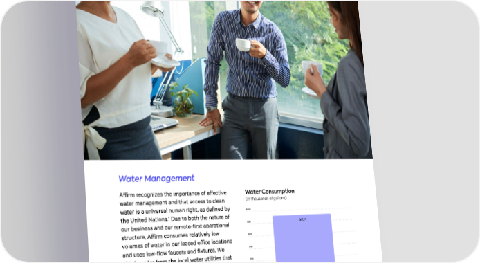 Water Managemen縀 A昀昀irm recognizes the importance of e昀昀ective Water Consumptio渀 (in thousands of gallons) water management and that access to clean water is a universal human right, as defined by 1000 the United Nations.1 Due to both the nature of 800 917.7 2 our business and our remote-first operational structure, A昀昀irm consumes relatively low 600 volumes of water in our leased o昀昀ice locations 400 and uses low-flow faucets and fixtures. We obtain water from the local water utilities that 200 serve our locations, and in FY’24, we began to 0 track our water usage at the o昀昀ice locations FY’23 where we receive a water utility bill. 1 The United Nations defines the right to water as universal access to su昀昀icient, safe, acceptable, physically accessible, and a昀昀ordable water. 2 Water consumption is presented only for o昀昀ice locations where A昀昀irm received a water utility bill during the 2023 fiscal year (Pittsburgh, Toronto and Chicago). For our Chicago o昀昀ice location, we calculated water consumption through a proration method that estimated our water usage based on our percentage square foot occupancy when compared to the building’s overall square footage. 2024 ESG REPORT 38