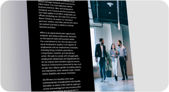 Code of Conduc縀 A昀昀irm’s Code of Ethics & Business Conduct†⠀ (the “Code”) is at the center of everything we do. It reflects our commitment to upholding high ethical and legal standards and is core to the A昀昀irm brand. The Code addresses ethical business practices, labor and employment standards, and inclusive workforce practices. Our Code applies to all A昀昀irm employees, our o昀昀icers (including our CEO and CFO), and our Board. Similarly, we expect our merchant partners, vendors, and other parties with which we conduct business to adhere to ethical business practices.ꨀ A昀昀irm is an equal employment opportunity employer and makes employment decisions†⠀ on the basis of merit and business needs.†⠀ Our commitment to non-discrimination and equal employment applies to all aspects of employment and our employment processes, including hiring, transfers, promotions, compensation, benefits, and disciplinary†⠀ action. We seek to comply with all applicable employment-related laws and regulations and†⠀ do not tolerate discrimination against anyone based on characteristics protected by law, such as age, race, religion, gender (including identity and expression), color, national origin, veteran status, disability, and sexual orientation㠀 All A昀昀irmers are required, both upon commencement of employment and annually thereafter, to attest to the Code by signing a written acknowledgement documenting their receipt, understanding, and agreement to comply with the Code. Additionally, A昀昀irmers†⠀ are required to complete mandatory training sessions on topics related to the Code,†⠀ including harassment prevention, anti-bribery & corruption, and insider trading. 2024 ESG REPORT 25
