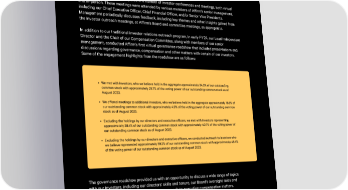 Stockholder engagemen縀 We seek regular engagement with investors to communicate our strategy and solicit feedback from the investment community. Management periodically engages a third-party consultant to obtain independent feedback from our investors.ꨀ In FY’24, management participated in a number of investor conferences and meetings, both virtual and in-person. These meetings were attended by various members of A昀昀irm’s senior management, including our Chief Executive O昀昀icer, Chief Financial O昀昀icer, and/or Senior Vice Presidents. Management periodically discusses feedback, including key themes and other insights gained from the investor outreach meetings, at A昀昀irm’s Board and committee meetings, as appropriate㠀 In addition to our traditional investor relations outreach program, in early FY’24, our Lead Independent Director and the Chair of our Compensation Committee, along with members of our senior management, conducted A昀昀irm’s first virtual governance roadshow that included presentations and discussions regarding governance, compensation and other matters with certain of our investors. Some of the engagement highlights from the roadshow are as follows: We met with investors, who we believe held in the aggregate approximately 34.3% of our outstanding common stock with approximately 25.7% of the voting power of our outstanding common stock as of August 2023 We o昀昀ered meetings to additional investors, who we believe held in the aggregate approximately 18.6% of our outstanding common stock with approximately 4.9% of the voting power of our outstanding common stock as of August 2023. Excluding the holdings by our directors and executive o昀昀icers, we met with investors representing approximately 38.4% of our outstanding common stock with approximately 40.7% of the voting power of our outstanding common stock as of August 2023 Excluding the holdings by our directors and executive o昀昀icers, we conducted outreach to investors who we believe represented approximately 59.2% of our outstanding common stock with approximately 48.4% of the voting power of our outstanding common stock as of August 2023. The governance roadshow provided us with an opportunity to discuss a wide range of topics with our investors, including our directors’ skills and tenure, our Board’s oversight roles and responsibilities, our ESG program, and our approach to executive compensation matters.ꨀ Our Board, as well as our management team, values the perspectives of our investors as it helps us to understand and evaluate the e昀昀ectiveness of our current practices and related disclosures. 2024 ESG REPORT 14