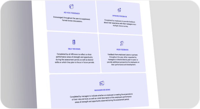 Performance managemen縀 A昀昀irm conducts regular performance evaluations to foster the growth and development of our employees. A昀昀irm’s performance and feedback program includes the following elements: Upward feedbac甀 Ad hoc feedbac甀 Completed by employees to provide feedback Encouraged throughout the year to supplement about their experience with their managers via a formal review discussions⸀ multiple choice survey. Peer feedbac甀 Self review紀 Feedback from employees’ peers or partners Completed by all A昀昀irmers to reflect on their throughout the year, either requested by performance areas of strength and opportunity managers or shared directly peer-to-peer, to during the assessment period, as well as desired provide additional perspective for employees on skills on which they plan to focus in future periods⸀ their performance and development. Manager review紀 Completed by managers to indicate whether an employee is meeting the expectations of their role and level, as well as a brief description of the employee’s performance areas of strength and opportunity observed during the assessment period. 2024 ESG REPORT 33