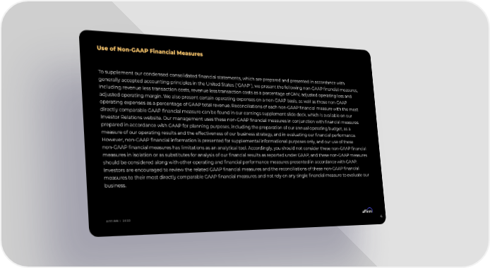 Use of Non-GAAP Financial Measures To supplement our condensed consolidated ûnancial statements, which are prepared and presented in accordance with generally accepted accounting principles in the United States ("GAAP"), we present the following non-GAAP ûnancial measures, including revenue less transaction costs, revenue less transaction costs as a percentage of GMV, adjusted operating loss and adjusted operating margin. We also present certain operating expenses on a non-GAAP basis, as well as those non-GAAP operating expenses as a percentage of GAAP total revenue. Reconciliations of each non-GAAP ûnancial measure with the most directly comparable GAAP ûnancial measure can be found in our earnings supplement slide deck, which is available on our Investor Relations website. Our management uses these non-GAAP ûnancial measures in conjunction with ûnancial measures prepared in accordance with GAAP for planning purposes, including the preparation of our annual operating budget, as a measure of our operating results and the effectiveness of our business strategy, and in evaluating our ûnancial performance. However, non-GAAP ûnancial information is presented for supplemental informational purposes only, and our use of these non-GAAP ûnancial measures has limitations as an analytical tool. Accordingly, you should not consider these non-GAAP ûnancial measures in isolation or as substitutes for analysis of our ûnancial results as reported under GAAP, and these non-GAAP measures should be considered along with other operating and ûnancial performance measures presented in accordance with GAAP. Investors are encouraged to review the related GAAP ûnancial measures and the reconciliations of these non-GAAP ûnancial measures to their most directly comparable GAAP ûnancial measures and not rely on any single ûnancial measure to evaluate our business. A F F I R M | 2 0 2 3 4