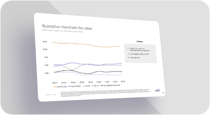 Illustrative merchant fee rates MDR has been stable on a like-for-like product basis Drivers ● Product mix - the most important driver of overall MDR ● Loan duration within 0% APR ● Merchant mix Core 0% Long includes loans with term lengths greater than 12 months and 0% APR; Core 0% Short includes loans with term lengths at least three months long but less than or equal to 12 months and 0% APR; Core IB includes loans with interest from Afûrm integrated merchants; Pay in 4 (formerly known as Split Pay) includes loans with 0% APR and 6-8 week term lengths; Non-Integrated Virtual Card A F F I R M | 2 0 2 3 includes loans made by Afûrm at non-integrated merchants using Afûrm's virtual card technology; excludes loans made in Canada via Afûrm or legacy Paybright business and excludes Returnly and Debit+ Card transactions. Metrics are unaudited. 12