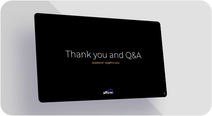 Thank you and Q&A Questions? ir@affirm.com A F F I R M | 2 0 2 3 35 Affirm Financial Model Information Session Page 34