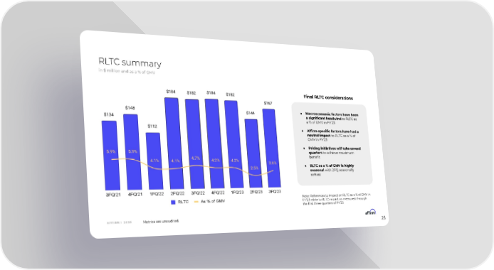 RLTC summary in $ million and as a % of GMV Final RLTC considerations ● Macroeconomic factors have been a significant headwind to RLTC as a % of GMV in FY’23 ● Affirm-specific factors have had a neutral impact to RLTC as a % of GMV in FY’23 ● Pricing initiatives will take several quarters to achieve maximum beneût ● RLTC as a % of GMV is highly seasonal with 2FQ seasonally softest Note: References to impact on RLTC as a % of GMV in FY’23 relate to RLTC impact as measured through the ûrst three quarters of FY’23 A F F I R M | 2 0 2 3 Metrics are unaudited. 25