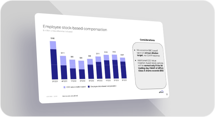 Employee stock-based compensation $ million unless otherwise indicated Considerations ● We establish SBC based upon an annual dilution target, not GAAP expense ● Additional CEO Value Creation Award stock options will be earned only if the 90 trading day VWAP of Affirm Class A shares exceeds $132 A F F I R M | 2 0 2 3 Metrics are unaudited. 32