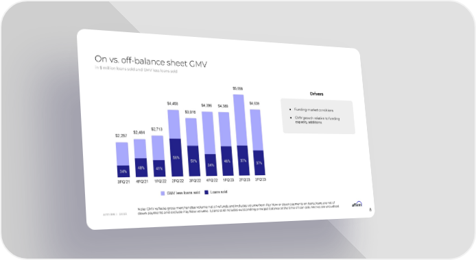 On vs. off-balance sheet GMV in $ million loans sold and GMV less loans sold Drivers ● Funding market conditions ● GMV growth relative to funding capacity additions Note: GMV reüects gross merchandise volume net of refunds and includes volume from Pay Now or down payments on loans; loans are net of A F F I R M | 2 0 2 3 down payments and exclude Pay Now volume. Loans sold includes outstanding principal balance at the time of loan sale. Metrics are unaudited. 8