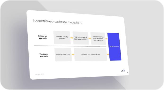 Suggested approaches to model RLTC Forecast revenue Bottom up Forecast GMV by Estimate on vs. off and transaction approach product balance sheet GMV cost line items RLTC forecast Top down Forecast total GMV Forecast RLTC as a % of GMV approach A F F I R M | 2 0 2 3 6