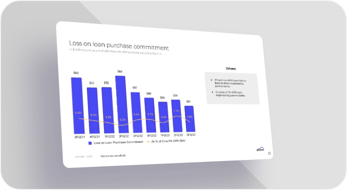 Loss on loan purchase commitment in $ millions and as a % of GMV from 0% APR products excluding Pay in 4 Drivers ● 0% and Low APR loans held on balance sheet originated by partner banks ● Duration of 0% APR loans originated by partner banks A F F I R M | 2 0 2 3 Metrics are unaudited. 22
