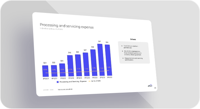 Processing and servicing expense in $ million and as a % of GMV Drivers ● Total GMV and platform portfolio size ● Mix of GMV originated at a large enterprise partner with a revenue-share agreement ● Repayment mix and servicing optimizations A F F I R M | 2 0 2 3 Metrics are unaudited. 20
