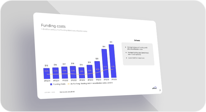 Funding costs in $ million and as a % of funding debt & securitization notes Drivers ● Average balance of funding debt plus securitization notes ● Average funding cost (benchmark rate + credit spreads) ● Loans held for investment A F F I R M | 2 0 2 3 Metrics are unaudited. 21