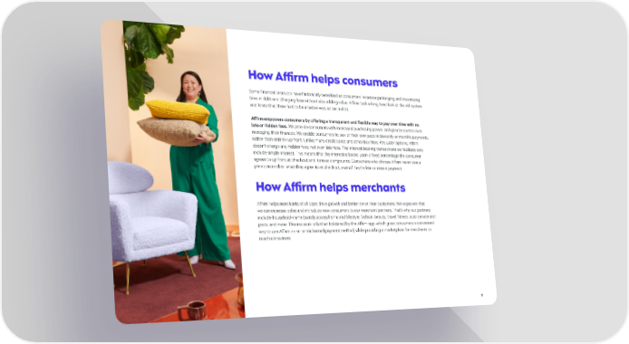 How Affirm helps consumers Some financial products have historically benefited at consumers’ expense: prolonging and maximizing time in debt and charging fees without also adding value. Affirm took a long, hard look at the old system and knew that there had to be a better way, so we built it. Affirm empowers consumers by offering a transparent and flexible way to pay over time with no late or hidden fees. We provide consumers with increased purchasing power, and greater control over managing their finances. We enable consumers to pay at their own pace in biweekly or monthly payments, rather than entirely up front. Unlike many credit cards and other Buy Now, Pay Later options, Affirm doesn’t charge any hidden fees, not even late fees. The interest-bearing transactions we facilitate only include simple interest. This means that the interest is based upon a fixed percentage the consumer agrees to up front at checkout and it never compounds. Consumers who choose Affirm never owe a penny more than what they agree to at checkout, even if they’re late or miss a payment. How Affirm helps merchants Affirm helps merchants of all sizes drive growth and better serve their customers. We’ve proven that we can increase sales and introduce new consumers to our merchant partners. That’s why our partners include household-name brands across home and lifestyle, fashion, beauty, travel, fitness, auto service and parts, and more. This network is further bolstered by the Affirm app, which gives consumers a convenient way to use Affirm as an omnichannel payment method, while providing a marketplace for merchants to reach consumers. 2