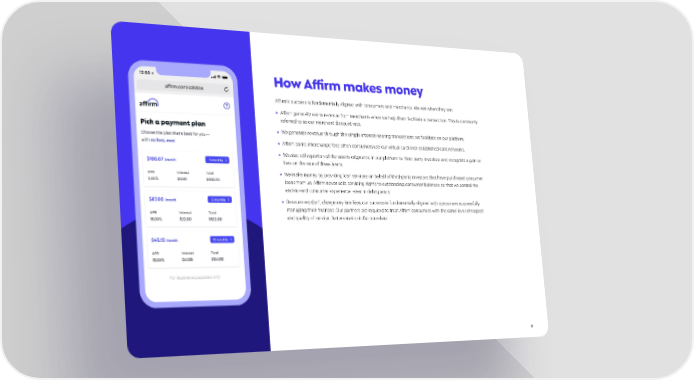 How Affirm makes money Affirm’s success is fundamentally aligned with consumers and merchants. We win when they win. • Affirm generally earns revenue from merchants when we help them facilitate a transaction. This is commonly referred to as our merchant discount rate. • We generate revenue through the simple interest-bearing transactions we facilitate on our platform. • Affirm earns interchange fees when consumers use our virtual card over established card networks. • We also sell a portion of the assets originated in our platform to third-party investors and recognize a gain or loss on the sale of these loans. • We make money by providing loan services on behalf of third-party investors that have purchased consumer loans from us. Affirm never sells servicing rights to outstanding consumer balances so that we control the end-to-end consumer experience, even in delinquency. • Because we don’t charge any late fees, our success is fundamentally aligned with consumers successfully managing their finances. Our partners are required to treat Affirm consumers with the same level of respect and quality of service that we maintain for ourselves. For illustrative purposes only 3