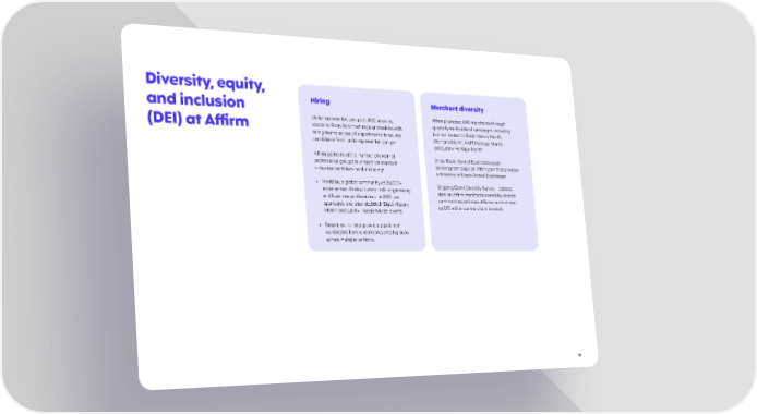 Diversity, equity, Hiring Merchant diversity and inclusion Underrepresented groups (URG) sourcing Affirm promotes URG merchants through (DEI) at Affirm sessions: Recruiters host regular sessions with quarterly multicultural campaigns, including hiring teams across all departments to source but not limited to Black History Month, candidates from underrepresented groups. Women’s Month, AAPI Heritage Month, and Latinx Heritage Month. Affirm partners with a number of external Shop Black-Owned Businesses page – professional groups to ensure we maintain an evergreen page on Affirm.com that provides a diverse candidate pool, including: a directory of Black-Owned Businesses. • Nextplay, a global community of 20,000+ Ongoing Client Diversity Survey – collects experienced Black & Latinx tech, engineering, data on Affirm merchants owned by diverse and business professionals. In 2021, we communities; enforces Affirm’s commitment sponsored and attended their Black History to DEI within our merchant network. Month and Latinx History Month events. • BreakLine, to help grow our pipeline of candidates from underrepresented groups across multiple verticals. 13