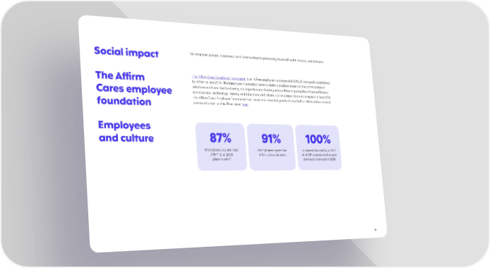 Social impact We empower people, businesses, and communities by promoting financial health, literacy, and inclusion. The Affirm The Affirm Cares Employee Foundation is an Affirm employee volunteer-led 501(c)3 non-profit established by Affirm in late 2019. The Employee Foundation aims to make a positive impact in the communities in which we work and live by sharing our expertise and funding across three impact pillars: financial literacy Cares employee and inclusion, technology training and education, and vibrant communities. Since its inception in late 2019, the Affirm Cares Employee Foundation has raised and awarded grants of over half a million dollars to local foundation community non-profits. Read more here. Employees 87% and culture 91% 100% of employees recommend of employees agree that increased favorability in 2021 Affirm as a “great Affirm values diversity of all DEI statements that were place to work” previously surveyed in 2020 11