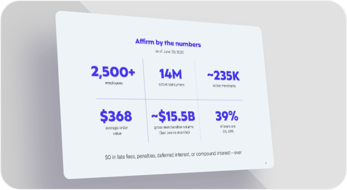 Affirm by the numbers as of June 30, 2022 2,500+ 14M ~235K employees active consumers active merchants $368 ~$15.5B 39% average order gross merchandise volume of loans are value (last twelve months) 0% APR $0 in late fees, penalties, deferred interest, or compound interest—ever 4