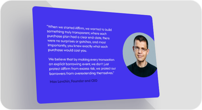 “When we started Affirm, we wanted to build something truly transparent, where each purchase plan had a clear end-date, there were no surprises or gotchas, and most importantly, you knew exactly what each purchase would cost you. We believe that by making every transaction an explicit borrowing event, we don’t just protect Affirm from excess risk, we protect our borrowers from overextending themselves.” Max Levchin, Founder and CEO