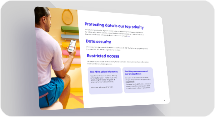Protecting data is our top priority We apply best practices that align with security industry standards for protecting personal information. Our policies safeguard the collection, use, and disclosure of information. We use a variety of methods to keep our network secure and data safe. More information can be found here. Data security When consumers share personal information, it’s transferred with TLS 1.2 or higher, a cryptographic protocol, then stored with AES 256-bit or higher encryption at rest. Restricted access We store encryption keys at an off-site facility. Access to customer data requires multi-factor authentication and is restricted to authorized personnel. How Affirm utilizes information Providing consumers control over privacy choices To perform and improve our services, including: performing transactions, maintaining accounts, Consumers are able to opt out at any time by and delivering relevant marketing based on changing their preferences in the app or emailing consumers’ communication preferences. [email protected]. Consumers have the right to receive notice of any Affirm never sells personal information. information we collect and to request or delete personal information, subject to applicable laws. 18