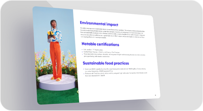 Environmental impact We actively manage our environmental impact across all areas of our operations. This includes practices and partnerships focused on addressing climate change, sustainably managing resources, and mitigating our environmental impact. We have partnered with an emission data collection platform to help us create a baseline on our carbon footprint. Energy and resource data collection will showcase a quantifiable view of Affirm’s impact and provide insights on where we can focus our ongoing efforts and make improvements. Notable certifications • Gold-certified LEED headquarters • Certified Green Business of the City and County of San Francisco • Requirements include: employee education, reducing waste footprint and increasing diversion rate, toxics reduction, green purchasing, and resource conservation Sustainable food practices • Saved over 19,000 pounds of produce that would have gone to waste and over 109,000 gallons of water, reducing our carbon footprint by +65,000 pounds of CO2e • Partnered with Good Use juice to reduce waste by using only “ugly” and surplus fresh produce that otherwise would have been disposed of in a landfill 19