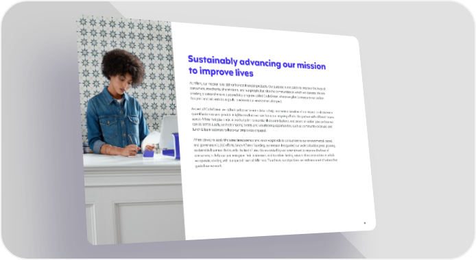 Sustainably advancing our mission to improve lives At Affirm, our mission is to deliver honest financial products. Our purpose is not solely to improve the lives of consumers, merchants, shareholders, and our people, but also the communities in which we operate. We are creating a comprehensive sustainability program, called CodeGreen, where we plan to measure our carbon footprint and set ambitious goals to address our environmental impact. As part of CodeGreen, we collect carbon emissions data to help us create a baseline of our impact to showcase a quantifiable view and provide insights on where we can focus our ongoing efforts. We partner with different teams across Affirm that play a role in our footprint, to monitor their contributions, and create an action plan on how we can do better. Lastly, we host ongoing events and volunteering opportunities, such as community cleanups and lunch & learn webinars to keep our employees engaged. Affirm strives to apply the same transparency and value we provide to consumers to our environmental, social, and governance (ESG) efforts. Since Affirm’s founding, our mission has guided our work to build a great, growing, sustainable business that stands the test of time. We are united by our commitment to improve the lives of consumers, to help our partners grow their businesses, and to deliver lasting value to the communities in which we operate, starting with our special team of Affirmers. To achieve our objectives, we embrace a set of values that guide how we work. 9