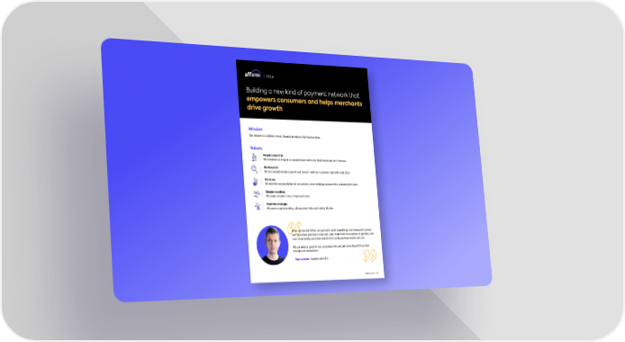 | 2024 Building a new kind of payment network that empowers consumers and helps merchants drive growth Mission Our mission is to deliver honest financial products that improve lives. Values People come first: We consider our impact on people’s lives before we think about our own interests. No fine print: We are completely transparent and honest—with our customers and with each other. It’s on us: We take full accountability for our actions, never shirking responsibility or passing the buck. Simpler is better: We make complex things simple and clear. Push the envelope: We never stop innovating, taking smart risks, and raising the bar. When we started A昀昀irm, we wanted to build something truly transparent, where each purchase plan had a clear end-date, there were no surprises or gotchas, and most importantly, you knew exactly what each purchase would cost you. We put what is good for our consumers first and will never benefit from their mistakes or misfortunes. - Max Levchin, Founder and CEO A昀케rm 2024 | 01