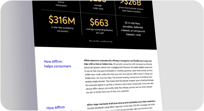 A昀케rm by the numbers as of June 30, 2024 >18M $293 >$26B active average gross merchandise volume consumers order value (last twelve months) $316M $663 $0 in late fees, penalties, deferred in late fees avoided by average outstanding balance interest, or compound 1 1 consumers per user interest—ever 1From July 2016 - June 2024; U.S. Only How A昀케rm A昀昀irm empowers consumers by o昀昀ering a transparent and flexible way to pay over helps consumers time with no late or hidden fees. We provide consumers with increased purchasing power and greater control over managing their finances. We enable eligible consumers to pay at their own pace in biweekly or monthly payments, rather than entirely up front. Unlike most credit cards and other pay-over-time options, A昀昀irm doesn’t charge any hidden fees, not even late fees. The interest-bearing transactions we facilitate only include simple interest. This means that the interest is based upon a fixed percentage the consumer agrees to up front at checkout and it never compounds. Consumers who choose A昀昀irm always see exactly what they will pay up front and are never charged any late or hidden fees, even if they miss a payment. How A昀케rm A昀昀irm helps merchants of all sizes drive growth and better serve their customers. helps merchants Overall, merchants using A昀昀irm reported a more than 70% lift in average cart sizes in fiscal year 2024. We’ve proven that we can increase sales and introduce new consumers to our merchant partners. That’s why our partners include household- name brands across home and lifestyle, fashion, beauty, travel, fitness, auto service and parts, and more. This network is further bolstered by the A昀昀irm app and A昀昀irm Card, which give consumers a convenient way to use A昀昀irm as an omnichannel payment method. A昀케rm 2024 | 02