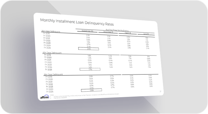 Monthly Installment Loan Delinquency Rates As of the Three Months Ending September 30 December 31 March 31 June 30 30+ Days Delinquent FY 2019 2.9% 2.5% 2.0% 1.9% FY 2020 2.5% 2.1% 1.9% 1.1% FY 2021 0.8% 0.8% 0.7% 0.9% FY 2022 1.5% 1.6% 2.1% 2.1% FY 2023 2.7% 2.4% 2.3% 2.1% FY 2024 2.4% 2.4% 2.3% 2.4% FY 2025 2.8% 60+ Days Delinquent FY 2019 1.6% 1.4% 1.2% 1.1% FY 2020 1.4% 1.2% 1.1% 0.8% FY 2021 0.5% 0.4% 0.4% 0.5% FY 2022 0.9% 0.9% 1.2% 1.2% FY 2023 1.6% 1.5% 1.4% 1.2% FY 2024 1.4% 1.4% 1.4% 1.5% FY 2025 1.7% 90+ Days Delinquent FY 2019 0.8% 0.7% 0.5% 0.5% FY 2020 0.6% 0.6% 0.5% 0.4% FY 2021 0.2% 0.2% 0.2% 0.2% FY 2022 0.4% 0.4% 0.5% 0.5% FY 2023 0.7% 0.7% 0.6% 0.5% FY 2024 0.7% 0.7% 0.6% 0.6% FY 2025 0.8% Notes: 27 1. US loans only, excludes Pay in X (formerly known as Split Pay) loan transactions with 0% APR and 4-8 week term lengths 2. Metrics are unaudited