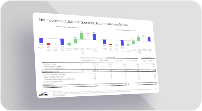 Net Income to Adjusted Operating Income Reconciliation Quarter Ending September 30, 2024 12 Months Ending September 30, 2024 $122 $130 $5 $451 $482 $(0) $94 $326 $177 $47 $3 $2 $(446) $(100) $(96) $(539) $(133) $(34) Net Income Other Income Tax Operating Depreciation Stock-Based Enterprise Restructuring Adjusted Net Income Other Income Tax Operating Depreciation Stock-Based Enterprise Restructuring Adjusted (Loss) Income Benefit Income and Compensation Warrant and Other Operating (Loss) Income Benefit Income and Compensation Warrant and Other Operating (Expense) (Expense) (Loss) Amortization and Share- Income (Expense) (Expense) (Loss) Amortization and Share- Income Based Based Expense Expense Quarter Ending 12 Months Ending December 31, 2023 March 31, 2024 June 30, 2024 September 30, 2024 September 30, 2024 Net Income (Loss) $ (167) $ (134) $ (45) $ (100) $ (446) (-) Other Income (Expense) (5) (28) (29) (34) (96) (-) Income Tax Benefit (Expense) (1) 1 1 2 3 Operating Income (Loss) $ (172) $ (161) $ (73) $ (133) $ (539) (+) Depreciation and Amortization 40 45 44 47 177 (+) Stock-Based Compensation 90 77 65 94 326 (+) Enterprise Warrant and Share-Based Expense 134 112 114 122 482 (+) Restructuring and Other 4 5 4 0 5 (+) Other Costs 4 4 4 4 4 Adjusted Operating Income (Loss) $ 93 $ 79 $ 150 $ 130 $ 451 Notes: 1. Dollars in millions 2. Adjusted Operating Income is calculated as GAAP operating loss, excluding: (a) depreciation and amortization; (b) stock-based compensation included in GAAP operating loss; (c) expenses related to 21 warrants and share-based payments granted to enterprise partners; (d) restructuring costs included in GAAP operating loss; and (e) certain other costs 3. Metrics are unaudited