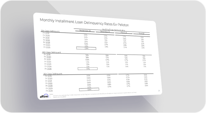 Monthly Installment Loan Delinquency Rates Ex-Peloton As of the Three Months Ending September 30 December 31 March 31 June 30 30+ Days Delinquent FY 2019 3.3% 3.2% 2.7% 2.6% FY 2020 3.2% 2.9% 2.8% 1.8% FY 2021 1.4% 1.3% 1.2% 1.3% FY 2022 2.1% 2.1% 2.7% 2.5% FY 2023 3.2% 2.7% 2.5% 2.3% FY 2024 2.5% 2.5% 2.4% 2.5% FY 2025 2.8% 60+ Days Delinquent FY 2019 1.9% 1.8% 1.6% 1.5% FY 2020 1.8% 1.7% 1.6% 1.3% FY 2021 0.8% 0.7% 0.7% 0.7% FY 2022 1.2% 1.2% 1.6% 1.4% FY 2023 1.9% 1.6% 1.5% 1.3% FY 2024 1.5% 1.5% 1.4% 1.5% FY 2025 1.7% 90+ Days Delinquent FY 2019 0.9% 0.9% 0.7% 0.6% FY 2020 0.8% 0.8% 0.7% 0.6% FY 2021 0.4% 0.3% 0.3% 0.3% FY 2022 0.6% 0.6% 0.6% 0.6% FY 2023 0.9% 0.8% 0.7% 0.6% FY 2024 0.7% 0.7% 0.7% 0.6% FY 2025 0.8% Notes: 28 1. US loans only, excludes Pay in X (formerly known as Split Pay) loan transactions with 0% APR and 4-8 week term lengths and loans made for Peloton purchases 2. Metrics are unaudited