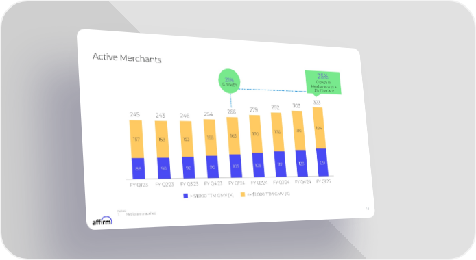 Active Merchants 25% Growth in 21% Merchants with > Growth $1k TTM GMV 323 303 292 279 266 254 245 246 243 194 180 176 170 163 158 153 157 153 129 123 117 109 103 96 92 88 90 FY Q1'23 FY Q2'23 FY Q3'23 FY Q4'23 FY Q1'24 FY Q2'24 FY Q3'24 FY Q4'24 FY Q1'25 > $1,000 TTM GMV (K)