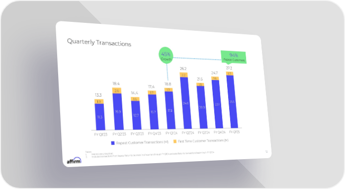 Quarterly Transactions 94% 45% Repeat Customers Growth 27.2 26.2 24.7 1.7 2.2 1.6 21.5 1.5 18.8 18.4 17.4 1.7 2.6 1.7 14.4 13.3 1.6 25.5 1.9 24.0 23.1 20.0 17.1 15.9 15.7 12.7 11.3 FY Q1'23 FY Q2'23 FY Q3'23 FY Q4'23 FY Q1'24 FY Q2'24 FY Q3'24 FY Q4'24 FY Q1'25 Repeat Customer Transactions (M) First Time Customer Transactions (M) Notes: 1. Metrics are unaudited 2. Includes transactions from legacy Returnly business in all quarters through FY Q1'24; excludes Returnly transactions beginning in FY Q2'24 12