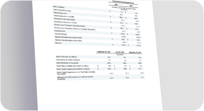 Key Operating Metrics, Non-GAAP Financial Measures and Supplemental Performance Indicators Three Months Ended September 30, 2024 2023 (in millions, except GMV and percent data) (unaudited) GMV (in billions) $ 7.6 $ 5.6 Total Transactions (count) 27.2 18.8 Total Revenue, net $ 698.5 $ 496.5 Total Revenue as a % of GMV 9.2 % 8.8 % Transaction Costs (Non-GAAP) $ 413.4 $ 284.2 Transaction Costs as a % of GMV 5.4 % 5.1 % Revenue Less Transaction Costs (Non-GAAP) $ 285.1 $ 212.4 Revenue Less Transaction Costs as a % of GMV (Non-GAAP) 3.8 % 3.8 % Operating Loss $ (132.6) $ (209.4) Operating Margin (19.0) % (42.2) % Adjusted Operating Income (Non-GAAP) $ 129.6 $ 59.9 Adjusted Operating Margin (Non-GAAP) 18.6 % 12.1 % Net Loss $ (100.2) $ (171.8) September 30, 2024 June 30, 2024 September 30, 2023 (unaudited) Active Consumers (in millions) 19.5 18.7 16.9 Transactions per Active Consumer 5.1 4.9 4.1 Active Merchants (in thousands) 323.0 303.0 266.3 Total Platform Portfolio (Non-GAAP) (in billions) $ 11.8 $ 11.0 $ 9.0 Equity Capital Required (Non-GAAP) (in millions) $ 581.3 $ 596.3 $ 441.1 Equity Capital Required as a % of Total Platform Portfolio (Non-GAAP) 4.9 % 5.4 % 4.9 % Allowance for Credit Losses as a % of Loans Held for Investment 5.6 % 5.5 % 5.1 % Affirm FQ1’25 Shareholder Letter 15