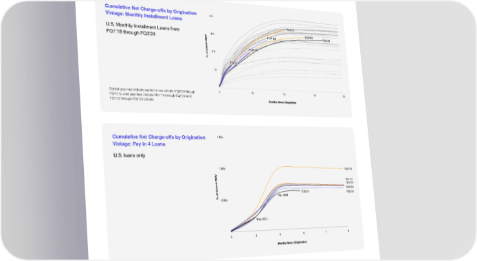 Net charge-off performance Recent monthly installment loan cohorts are continuing to perform in-line with, or better than, historical cohorts that originated prior to the COVID pandemic on the basis of cumulative charge-offs as a percentage of GMV. Cohorts originated during FY’24 are also performing consistent with the cohorts originated during the same period in FY’23. Cumulative Net Charge-offs by Origination Vintage: Monthly Installment Loans U.S. Monthly Installment Loans from FQ1’18 through FQ3’24 Dotted gray lines indicate pandemic-era cohorts (FQ3’20 through FQ4’21), solid gray lines indicate FQ1’18 through FQ2’20 and FQ1’22 through FQ1’23 cohorts Cumulative Net Charge-offs by Origination Vintage: Pay in 4 Loans U.S. loans only Ongoing improvements in our underwriting process have enabled us to deliver substantial reductions in credit costs for Pay in 4 loans. As a percentage of GMV, loss rates for Pay in 4 loans have continued to track to less than 1% for loans originated during FY’24. Affirm FQ1’25 Shareholder Letter 11