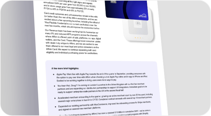 Although we've been highlighting Afûrm Card progress in the last couple of these letters, the Card is proving to be a gift that keeps on giving, so a brief update is warranted. In ûscal Q1, Card growth accelerated on both the top and bottom line, each more than doubling year over year. We had over 1.4 million active cardholders at quarter end. As cohorts mature, we are observing all the right signs and signals: annualized GMV per user grew from $2,500 to over $3,000, and in-store usage grew from approximately 25% in early FY’24 to 40% in FQ4’24 and 45% in FQ1’25. Card credit outcomes and unit economics remain in-line with (or better than) the rest of the Afûrm ecosystem, and we are excited about a few upcoming launches, including the rollout of Visa Flexible Credential to our current cardholders over the next few months, which should improve the economics further. Our Revenue team has been working hard to harmonize our many 0% and reduced-APR programs across the channels where Afûrm is offered: point of sale, platforms, our app, digital wallets, and the Card. These offerings boost consumer uptake with deals truly unique to Afûrm, and we are excited to see them offered to our most loyal and active consumers on the Afûrm Card. We expect to continue expanding both card eligibility and individual purchasing power for cardholders. A few more brief highlights: ● Apple Pay: Went live with Apple Pay towards the end of the quarter in September, providing consumers with the option to pay over time with Afûrm when checking out on Apple Pay online and in-app on iPhone and iPad. Excited to be working together to bring users even more ways to pay. ● You hear that, Doug? I’m coming to London! Launched in the United Kingdom with our ûrst few merchant partners and are expanding our distribution partnerships to support UK integrations. Immediate goal is to be ready to support enterprise-scale partners in the UK in the second ûscal half. ● Accelerated merchant onboarding in the quarter, growing our active merchant count by over 20 thousand, including several major enterprises to launch in CY’25. Completed contract renewals with several top-10 merchant partners. ● Expanded our existing partnership with WooCommerce, improved the onboarding process for Stripe merchants, and signed on several new merchant platforms. ● Shop Pay Installments (powered by Afûrm) has now surpassed $10 billion in cumulative GMV – we’ve come a really long way since Shopapalooza! Very much looking forward to growing our joint programs with Shopify, which now include Shop Pay Commerce Component, aka off-Shopify Shop Pay. Affirm FQ1’25 Shareholder Letter 4