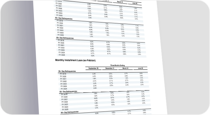SUPPLEMENTAL DELINQUENCY INFORMATION Monthly Installment Loan Three Months Ending September 30 December 31 March 31 June 30 30+ Day Delinquencies FY 2019 2.9% 2.5% 2.0% 1.9% FY 2020 2.5% 2.1% 1.9% 1.1% FY 2021 0.8% 0.8% 0.7% 0.9% FY 2022 1.5% 1.6% 2.1% 2.1% FY 2023 2.7% 2.4% 2.3% 2.1% FY 2024 2.4% 2.4% 2.3% 2.4% FY 2025 2.8% 60+ Day Delinquencies FY 2019 1.6% 1.4% 1.2% 1.1% FY 2020 1.4% 1.2% 1.1% 0.8% FY 2021 0.5% 0.4% 0.4% 0.5% FY 2022 0.9% 0.9% 1.2% 1.2% FY 2023 1.6% 1.5% 1.4% 1.2% FY 2024 1.4% 1.4% 1.4% 1.5% FY 2025 1.7% 90+ Day Delinquencies FY 2019 0.8% 0.7% 0.5% 0.5% FY 2020 0.6% 0.6% 0.5% 0.4% FY 2021 0.2% 0.2% 0.2% 0.2% FY 2022 0.4% 0.4% 0.5% 0.5% FY 2023 0.7% 0.7% 0.6% 0.5% FY 2024 0.7% 0.7% 0.6% 0.6% FY 2025 0.8% Monthly Installment Loan (ex-Peloton) Three Months Ending September 30 December 31 March 31 June 30 30+ Day Delinquencies FY 2019 3.3% 3.2% 2.7% 2.6% FY 2020 3.2% 2.9% 2.8% 1.8% FY 2021 1.4% 1.3% 1.2% 1.3% FY 2022 2.1% 2.1% 2.7% 2.5% FY 2023 3.2% 2.7% 2.5% 2.3% FY 2024 2.5% 2.5% 2.4% 2.5% FY 2025 2.8% 60+ Day Delinquencies FY 2019 1.9% 1.8% 1.6% 1.5% FY 2020 1.8% 1.7% 1.6% 1.3% FY 2021 0.8% 0.7% 0.7% 0.7% FY 2022 1.2% 1.2% 1.6% 1.4% FY 2023 1.9% 1.6% 1.5% 1.3% FY 2024 1.5% 1.5% 1.4% 1.5% FY 2025 1.7% 90+ Day Delinquencies FY 2019 0.9% 0.9% 0.7% 0.6% FY 2020 0.8% 0.8% 0.7% 0.6% FY 2021 0.4% 0.3% 0.3% 0.3% FY 2022 0.6% 0.6% 0.6% 0.6% FY 2023 0.9% 0.8% 0.7% 0.6% FY 2024 0.7% 0.7% 0.7% 0.6% FY 2025 0.8% Affirm FQ1’25 Shareholder Letter 26