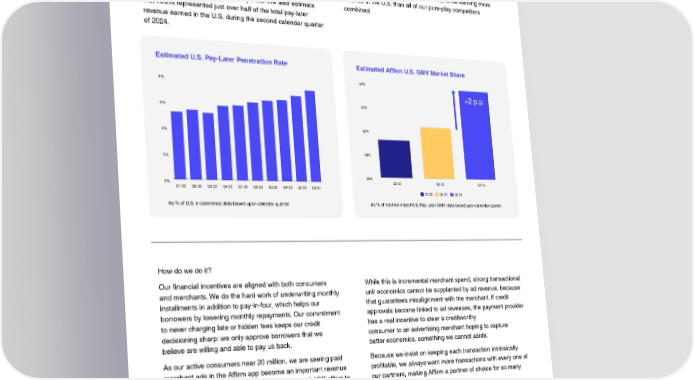 2 A few words on the state of the pay-later market and our position in it. We estimate that total U.S. pay-later GMV as a percentage of In other words, Afûrm is growing faster than U.S. e-commerce U.S. e-commerce reached approximately 7.4% in the second itself (by well over 4x: 7% e-commerce growth in CQ2 vs. calendar quarter of 2024, adding about one percentage point 31% for Afûrm in CQ2 and 35% in CQ3), while earning more over the preceding 12 months. Afûrm accounted for 34% of revenue in the U.S. than all of our pure-play competitors that, up from 32% in the prior-year period. We also estimate combined. that Afûrm represented just over half of the total pay-later revenue earned in the U.S. during the second calendar quarter of 2024. Estimated U.S. Pay-Later Penetration Rate Estimated Affirm U.S. GMV Market Share +2 p.p. As % of total estimated U.S. Pay-Later GMV; data based upon calendar quarter As % of U.S. e-commerce; data based upon calendar quarter How do we do it? Our ûnancial incentives are aligned with both consumers While this is incremental merchant spend, strong transactional and merchants. We do the hard work of underwriting monthly unit economics cannot be supplanted by ad revenue, because installments in addition to pay-in-four, which helps our that guarantees misalignment with the merchant. If credit borrowers by lowering monthly repayments. Our commitment approvals become linked to ad revenues, the payment provider to never charging late or hidden fees keeps our credit has a real incentive to steer a creditworthy decisioning sharp: we only approve borrowers that we consumer to an advertising merchant hoping to capture believe are willing and able to pay us back. better economics, something we cannot abide. As our active consumers near 20 million, we are seeing paid Because we insist on keeping each transaction intrinsically merchant ads in the Afûrm app become an important revenue proûtable, we always want more transactions with every one of stream. We love using it to fund 0% and reduced-APR offers to our partners, making Afûrm a partner of choice for so many delight our consumers and to meaningfully increase Afûrm enterprises. uptake at the point of sale. 2 Based upon Affirm internal estimates. U.S. e-commerce market size based upon U.S. Census Bureau data. Affirm’s pure-play competitors are Afterpay, Klarna, PayPal Pay Later, Sezzle, and Zip. These estimates exclude GMV and revenue from all other competitors, including post-purchase installment loans originated by card issuers. Affirm FQ1’25 Shareholder Letter 33