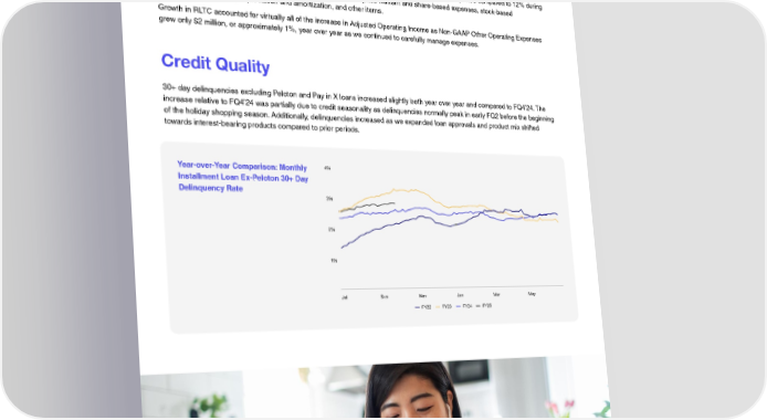 Adjusted Operating Income Adjusted Operating Income increased $70 million year over year to $130 million, compared to $60 million in FQ1’24. Adjusted Operating Income as a percentage of Revenue, or Adjusted Operating Margin, was 19% during the period compared to 12% during FQ1’24. Adjusted Operating Income excludes the impact of enterprise warrant and share-based expenses, stock-based compensation expense, depreciation and amortization, and other items. Growth in RLTC accounted for virtually all of the increase in Adjusted Operating Income as Non-GAAP Other Operating Expenses grew only $2 million, or approximately 1%, year over year as we continued to carefully manage expenses. Credit Quality 30+ day delinquencies excluding Peloton and Pay in X loans increased slightly both year over year and compared to FQ4’24. The increase relative to FQ4’24 was partially due to credit seasonality as delinquencies normally peak in early FQ2 before the beginning of the holiday shopping season. Additionally, delinquencies increased as we expanded loan approvals and product mix shifted towards interest-bearing products compared to prior periods. Year-over-Year Comparison: Monthly Installment Loan Ex-Peloton 30+ Day Delinquency Rate Affirm FQ1’25 Shareholder Letter 10